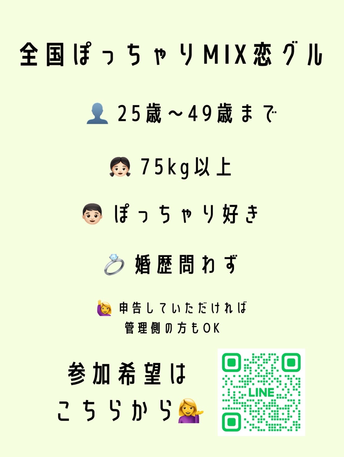 🎀参加条件🎀 ▶女子:75kg以上のぽっちゃりさん ▶男子:ぽっちゃり好き限定💘 ▶年齢:25歳〜45歳 ▶婚歴問わず 💌ツーショット部屋完備 ☕雑談しながら、恋も本気で楽しもう💞 🚨今だけ知り合い確認ゆるめ!