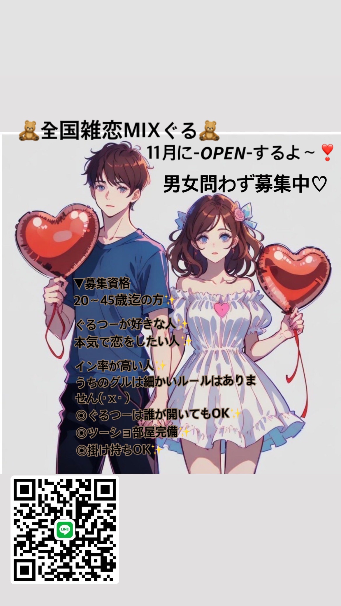 みんなで恋しませんか??٩(ˊᗜˋ*)و 11月に𝙊𝙋𝙀𝙉-しますよ〜!!! 新規グル立ち上げの為メンバー大大大募集ヾノ。ÒдÓ)ノシ バンバン!! ▼募集資格 20〜45歳迄の方✨ 既婚者、バツ有り、独身、シングル なんでも有り✨️ ぐるつーが好きな人✨ 本気で恋をしたい人✨ イン率が高い人✨ うちのグルは細かいルールはありません(・ⅹ・) ◉ぐるつーは誰が開いてもOK✨ ◉ツーショ部屋完備✨ ◉掛け持ちOK✨ ◉人数が増えればイベントも…??ワ ━(⊙ꇴ⊙)━ オ… 我こそはイケメン/イケ女の方 募集お待ちしてます٩(ˊᗜˋ*)و 深夜勢 大大大募集中.ᐟ.ᐟ.ᐟ