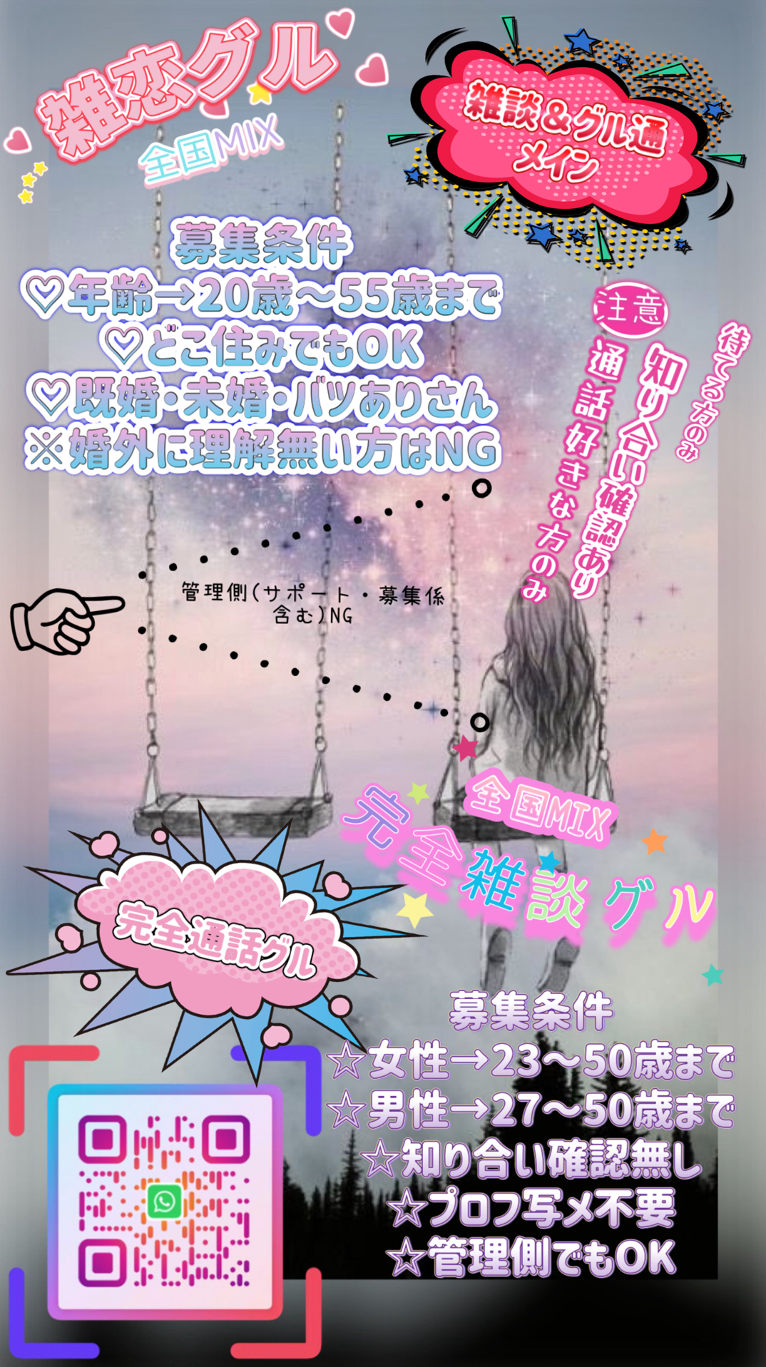 こちらのグルは関東と関西限定で行っている雑談グルです 今年で5年目になりました 特にルールなどは無く基本自由なグルです 皆さん日常の雑談会話を通じ楽しくトークされております 未婚、既婚者は特に問いません、良識をお持の方であれは参加は自由です 女性にも大変優しいグルですよ グループ通話は24時間誰が立ち上げてもOK オフ会なども定例して行っております 写真提供などは行いません、必要なのは簡単なプロフのみ明るく話し好きな関東、関西在住の35歳から65歳位迄の男女からの参加応募をお待ちしております https://line.me/ti/P/_hJT41/WLH