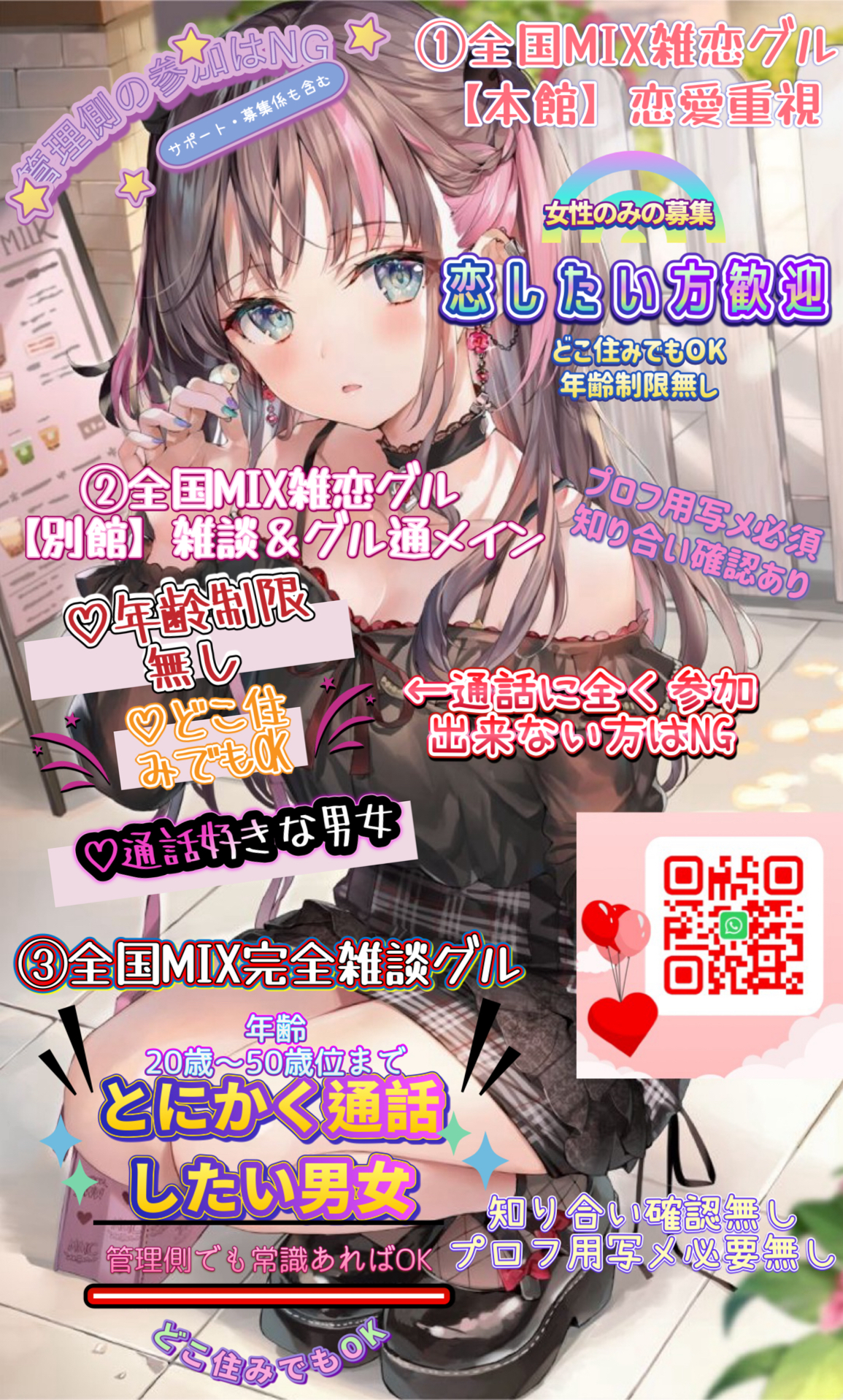 ②全国MIX雑恋グル【別館】雑談&グル通メイン🤙📱 通話好きな男女を募集中です💁♀️ 全くグル通に参加出来ない方はNG