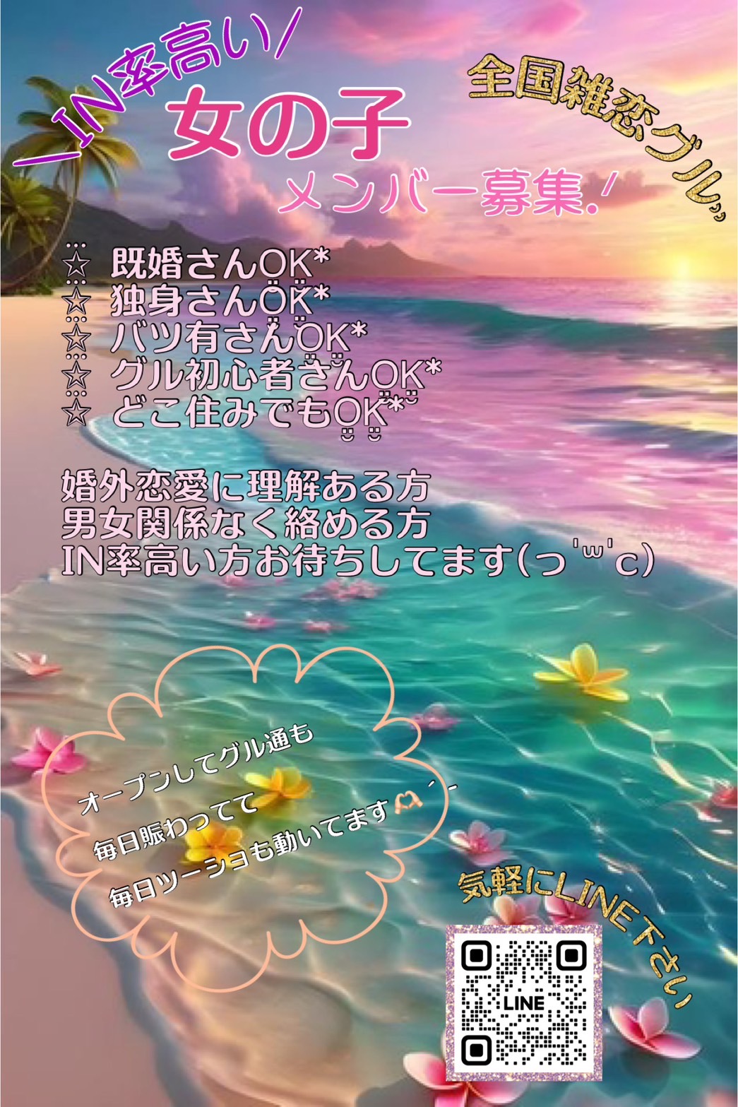♡20代後半〜50代前半まで ♡未婚、既婚、バツ問いません ♡婚外恋愛に理解のある方 ♡加工無し、マスク、サングラスのしてない写真2枚いただきます ♡デート制度あります ♡グル通24時間自由です ♡イベントもあり