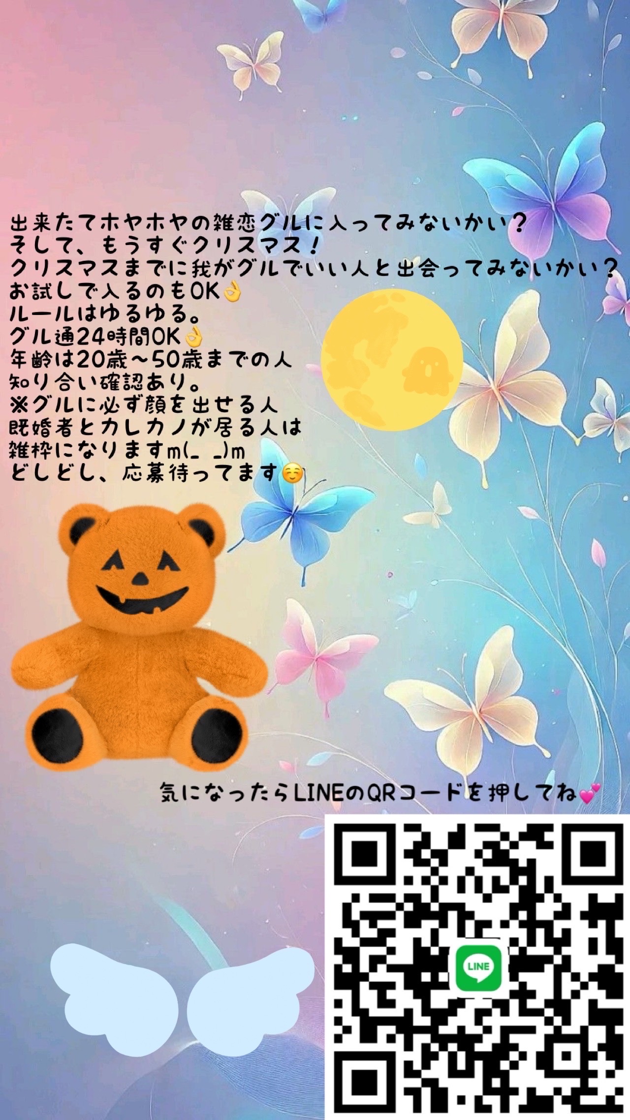 人肌 寒い季節となったね(´・ω・`) 冬と言えば何を思い付きますか? クリスマス!クリスマスまでに是非、我がグルでいい人と出会って恋をしてみないかい?何とカップルも2組は誕生してるよ♡男性も女性も大募集中♡イケメン、美女が居るよ(*^^*)美男子と美女も募集中! ツーショットを3回以上すればデート申請も出来ちゃう♡ 自グルの管理側だとなかなか恋愛は出来ませんよね。 そいう方も是非とも参加して下さい😊 ルールは緩々(*´ω`*) 24時間グル通OK👌 話し好きな人も大募集中♡ お試しで入るのもあり(๑•̀ㅂ•́)و✧ ルールを守れる人のみ!グルに顔を出せる人! 既婚者とカレカノが居る人は雑枠になりますm(_ _)m イベントも毎月してるつもり(笑) 年齢 は20歳~50歳迄の人で。 知り合い確認ありますm(_ _)m なので、どしどし応募待ってまーす😊LINEのQRコードを読み込んでね♡