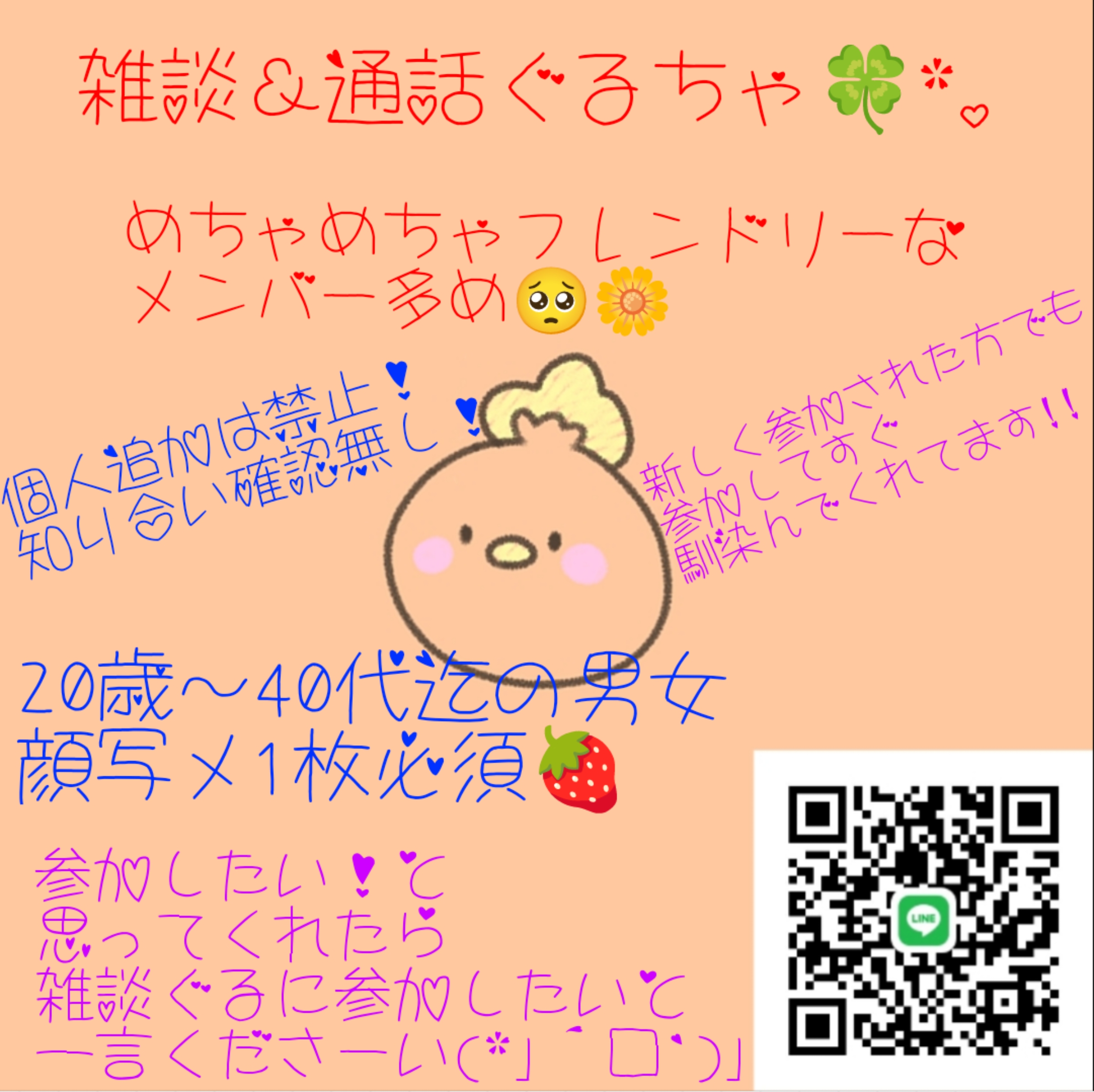⭕下ネタ好き、或いは不快に感じない方 ⭕婚外恋愛に嫌悪感を持たない方、或いは婚外恋愛中の方 ⭕出会い目的でない方 ⭕ROMにならない方 ⭕2~3日に一度位はイン出来る方 ⭕挨拶スタンプだけではなく話を膨らませる事が出来る方 💮グルチャ乗っ取ってやるぞ!みたいなノリの良い方(本当に乗っ取らないでください(^_^;)