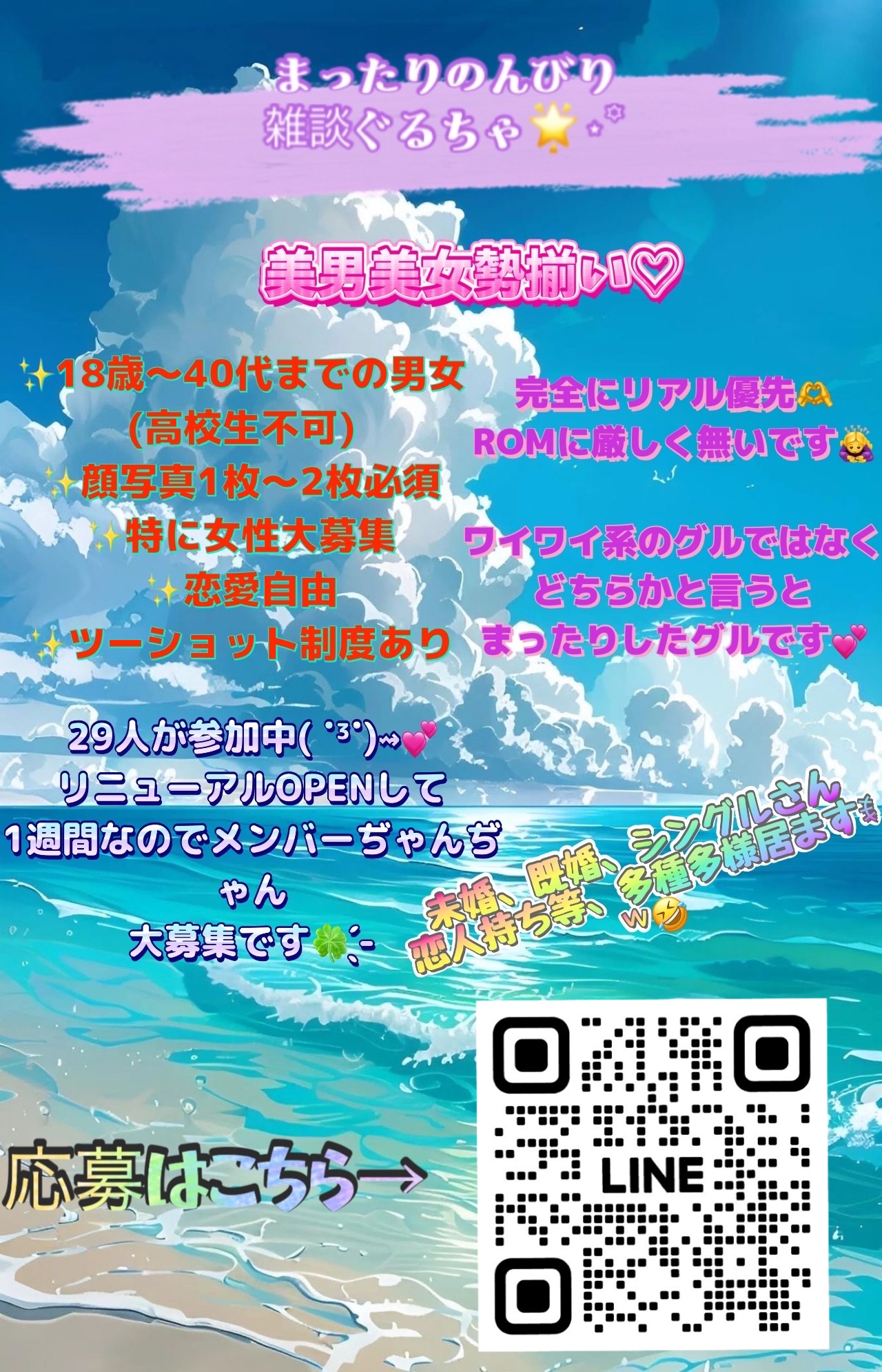🍀全国MIX雑恋グル🍀 オープニングメンバー男女ともに大募集((#♡-♡#)) ✨参加条件✨ 🌈20代から50代までの男女 🌈男女ともに仲良くしてくれる方 🌈通話好きの方 🌈盛り上げ上手の方
