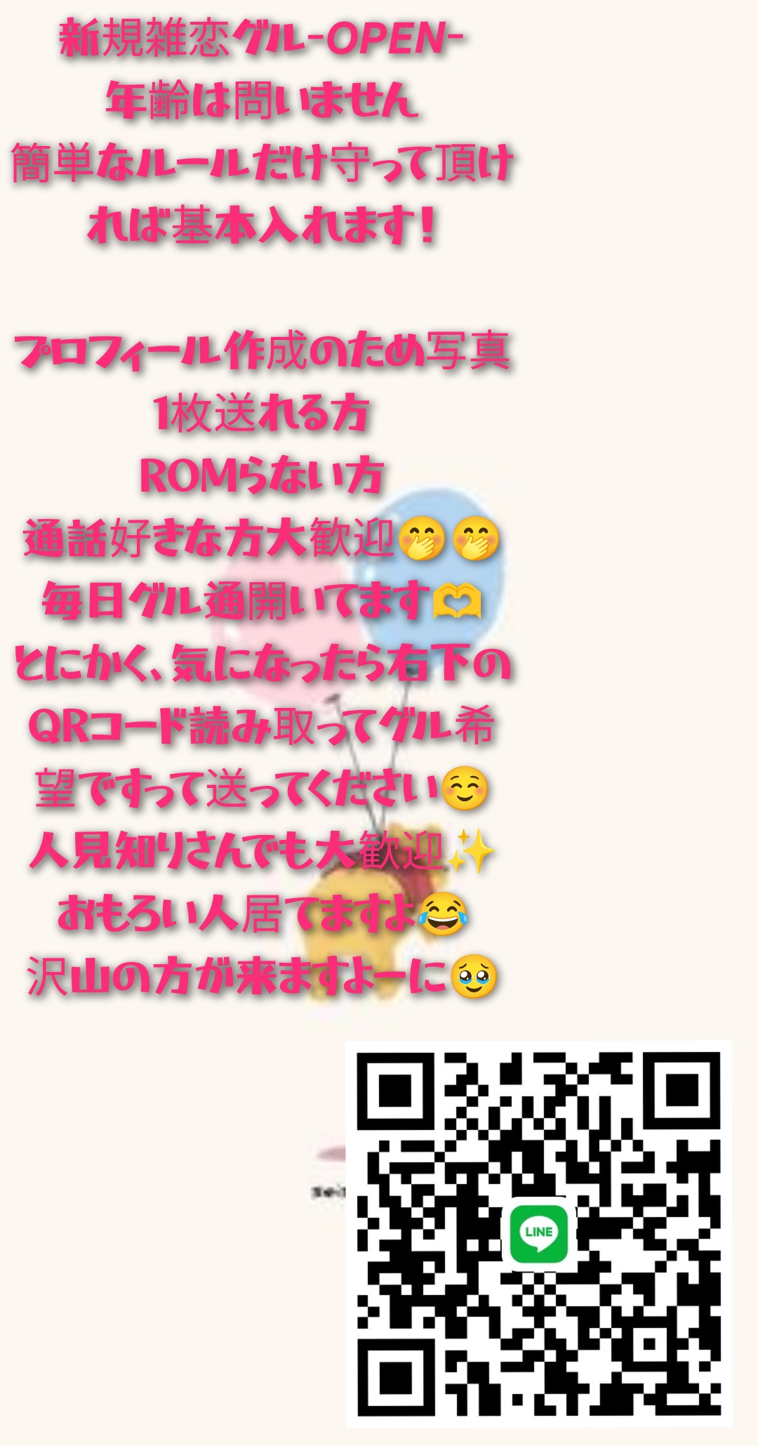 流れも早くないし 面倒なイベ事もないし 恋グルみたいにガツガツした人いないし まった〜り楽しみたい方には もってこいの場所なの❗️ 募集条件に当てはまる方は 急いでメッセージしてきて(๑˃ꇴ˂๑)