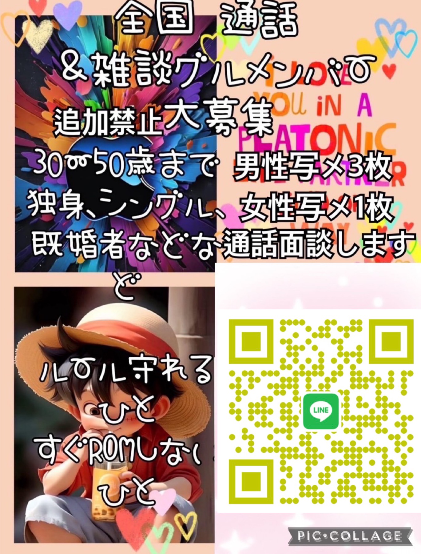 ✨20~50歳くらいまで ✨独身、未婚、既婚、シングルなど不問 ✨ノリいい人 ✨通話好き ✨恋したい人(恋枠) ✨とにかく楽しみたい人(雑枠) ✨訳ありでグル参加出来ない(要相談) ✨管理側(要相談)
